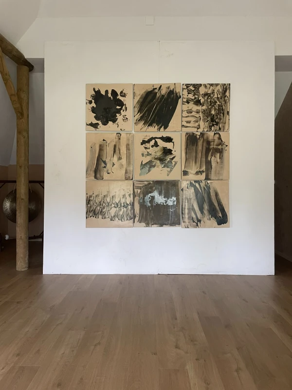 De penseelstreek of de boetseerhandeling ontstaat vanuit stilte, aandacht en concentratie. In dat ene gebaar valt alles samen: lichaam, adem, geest, het penseel, het papier. Niets staat op zichzelf. Wat zichtbaar wordt is het spoor van dat moment: een moment waarin er geen scheiding meer is tussen maker en gemaakte vorm.